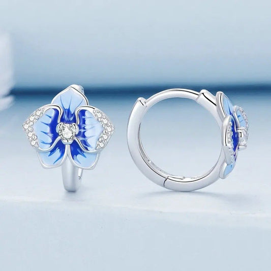 Blue Enamel Iris Ear Buckles Flower Hoop Earrings